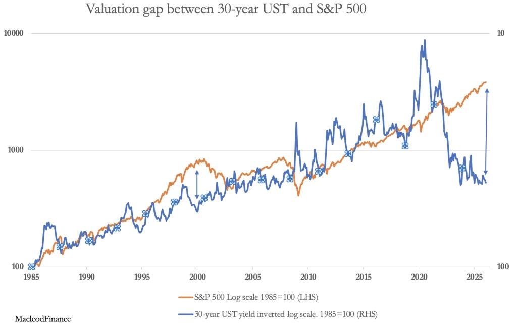 For every debt, there is a credit and in recent years significant quantities of this credit, has found its way into financial instruments, particularly equities. As the interest cost on this debt increases, the credit side of the bubble will burst. Today, the disparity between the returns on long maturity bonds and equities is at an all-time record, illustrated by the chart below:
